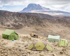 After breakfast, you pack up for the day’s trek, which will consist of moorland terrain. The trek to Second Cave is pretty consistent in respect to grade and ascent. Along the way, you will catch some terrific views of Kibo and get your first glimpse of the ice fields on the Eastern crater rim. The small shrubs of the moorland become thinner as you approve the Second Cave. This is where you will stop for a short rest and have your lunch. At this point, you will break off of the beaten path and head east across the moorland on a less-traveled path toward Mawenzi. After trekking 10km, you will enter a cozy valley filled with the giant Senecios plants and the nearby Kikelewa Cave. It is here at the Kikelewa Camp where you will settle in for the night.